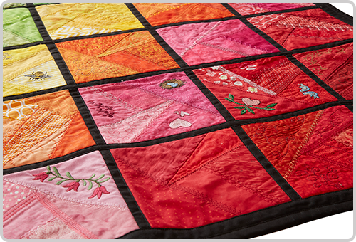 Custom quilting enhances specific areas of a quilt such as blocks, sashing and borders using multiple designs, whereas edge to edge or allover quilting repeats the same design. This technique accents embroidered and appliqued elements while filling the surrounding shapes with beautiful, quilted texture. Custom quilting is what stops you in your tracks at quilt shows.