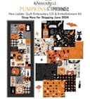 Come stitch a spell with Kimberbell’s Pumpkins & Potions Ladder Quilt! Our enchanting 20" x 60” quilt features everything you love about Halloween, including ghosts, bats, spiders, and more. Piece plaid blocks in-the-hoop, create dimensional jars with clear vinyl, and adorn your quilt with rhinestones, fairy lights, and other bewitching embellishments! Each boo-tiful block is stitched in a 5" x 7" machine embroidery hoop with a variety of charming techniques. From candles and cobwebs to each spooky sentiment, our Pumpkins & Potions Ladder Quilt is sure to raise your “spirits!”