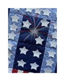 Stars and Stripes are featured in this three block wall-hanging with border. Fireworks are exploding in the top block while 3D stars are featured on the top 2/3 of the quilt. Red and white strips are featured at the bottom of the wall hanging.